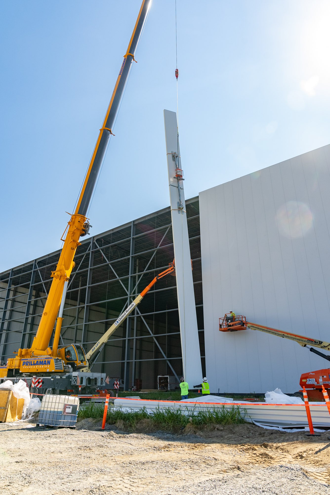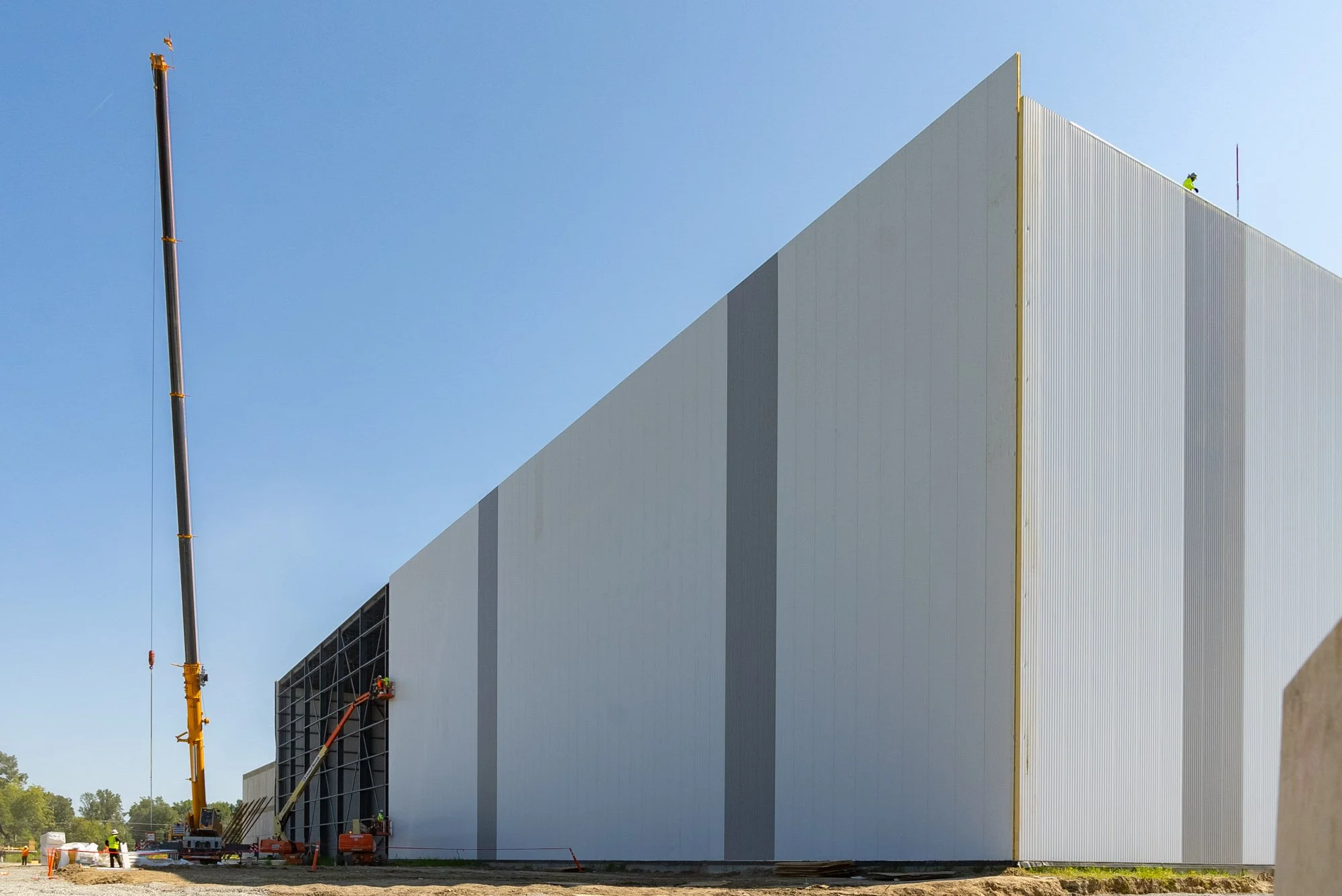 The insulated metal panels used for this freezer stretch an impressive 67 feet in height on average—each a single panel from top to bottom—with the tallest panel reaching up to 72 feet. In most cases, when reaching this height, our team would install a double-stacked panel system. However, to meet the client’s aesthetic vision and achieve a seamless design with accent sections of gray panels, we opted for single panels spanning the entire height of the structure. Handling and installing such long panels posed logistical hurdles. From transportation to on-site maneuvering, careful planning was essential. Careful coordination among our team ensured that the panels were maneuvered without damage to the materials or surrounding property.